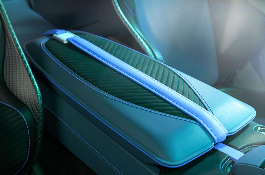 Драматизма внешности придает и стандартный углепластиковый декор, а также колеса диаметром 21 дюйм. Такие диски мы уже видели на гиперкаре Valkyrie и инфернальном купе Victor. Салон украшают сиденья Sports Plus, обитые кожей и алькантарой, и карбоновые подрулевые лепестки. Новшества — контрастная двухцветная отделка и изготовленный на заказ ремешок на центральном подлокотнике, на пряжке которого выгравирован логотип DBS 770 Ultimate.