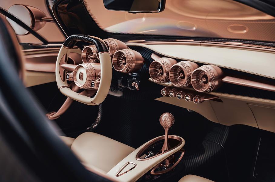 Салон P72 — настоящее произведение искусства. Отдельного внимания заслуживает рычаг коробки передач с открытой кулисой и колодцы приборов из фрезерованного алюминия. Каждая деталь сделана на заказ мастерами-ремесленниками и обработана одним из трех способов: пескоструйной обработкой, шлифовкой либо полировкой. Мультимедиа у суперкара нет. Но в качестве навигатора можно использовать смартфон, который устанавливается в специальный держатель.