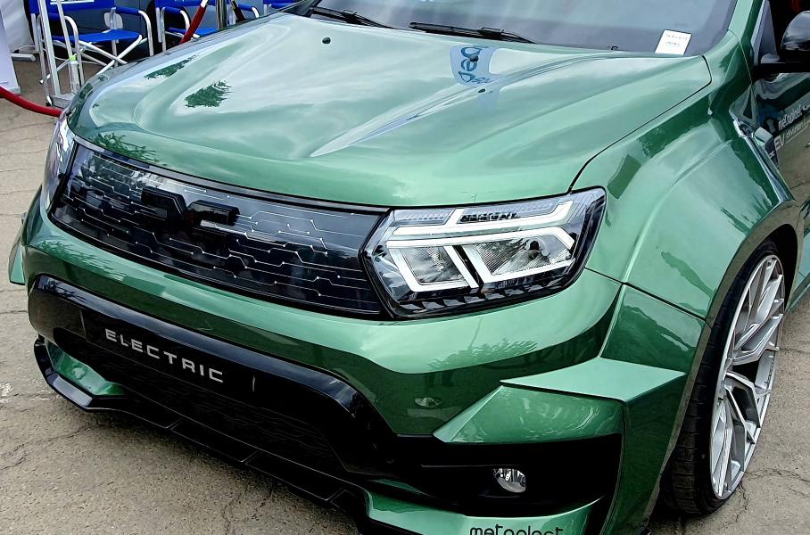Кроссоверу пересадили двигатель от Nissan Leaf«Зеленый» Dacia Duster задумывался как тестовый автомобиль для деталей компании Metaplast, которая изготавливает пластиковые детали для автомобильной промышленности, а также электромобильные зарядки. Кроссоверу достался обвес Prior Design, с крупными бамперами, расширенными колесными арками, скрывающими большие колеса, увеличенными порогами, диффузором и заглушкой на месте решетки радиатора.