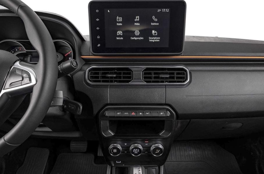 В салоне появился другой руль, горизонтальные дефлекторы воздуховодов, иные дверные карты, а также новая «приборка», сменившая резной козырек на ровный, – ее Oroch взял в Kaptur. По центру расположен «парящий» дисплей мультимедийной системы диагональю восемь дюймов.