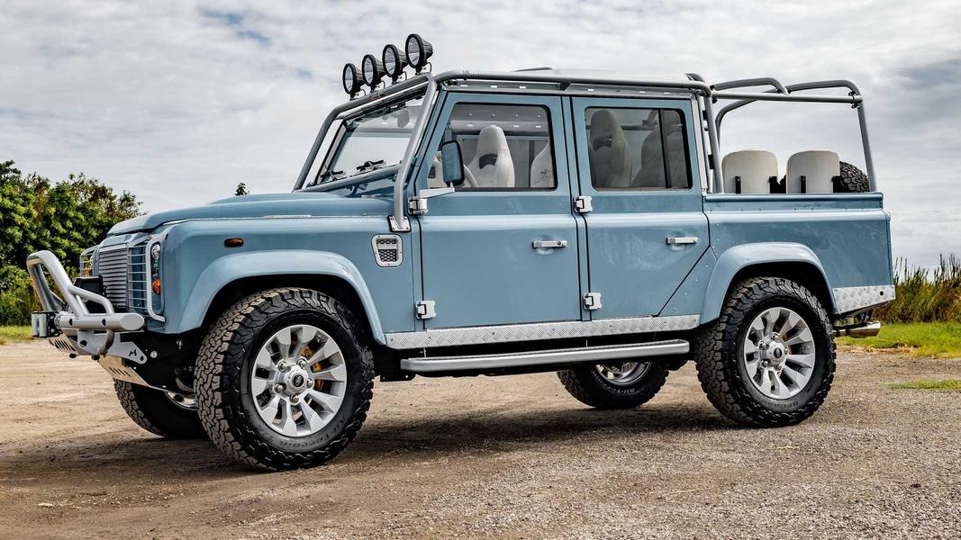 А под капотом появился двигатель General MotorsАвтомобиль, получивший название Project Hutton, построен на базе Land Rover Defender 110 Soft Top с мягким верхом. После тщательной реставрации специалисты вместо штатного двигателя затем установили 640-сильный компрессорный V8 6.2 LT4 производства General Motors, дополненный 8-ступенчатой автоматической коробкой передач и усиленными осями. Стандартные тормоза заменили механизмами Brembo.