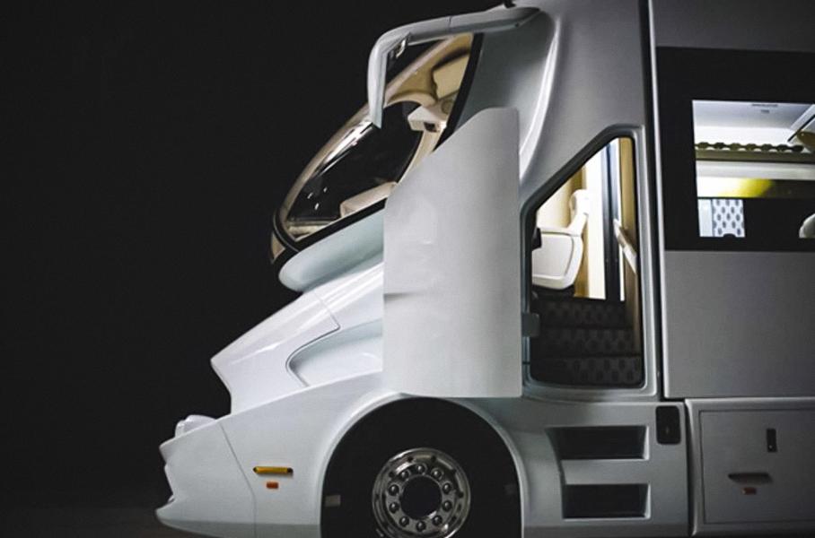Разработчики будут выпускать всего пять уникальных автодомов в годВ проекте Elemment Palazzo австрийские специалисты воплотили наработки 70-х годов прошлого столетия. В частности, инженеры опирались на чертежи известного дизайнера Луиджи Колани. Экстерьер 12-метровой машины выполнили из композитных материалов. Благодаря уникальной конструкции кузова и лобового стекла автодом экономит 20 процентов топлива по сравнению с транспортными средствами аналогичного размера. 20-тонный дом на колесах оборудован самолетным трапом, а также палубой с крышей от солнца, попасть на которую можно с помощью лифта.