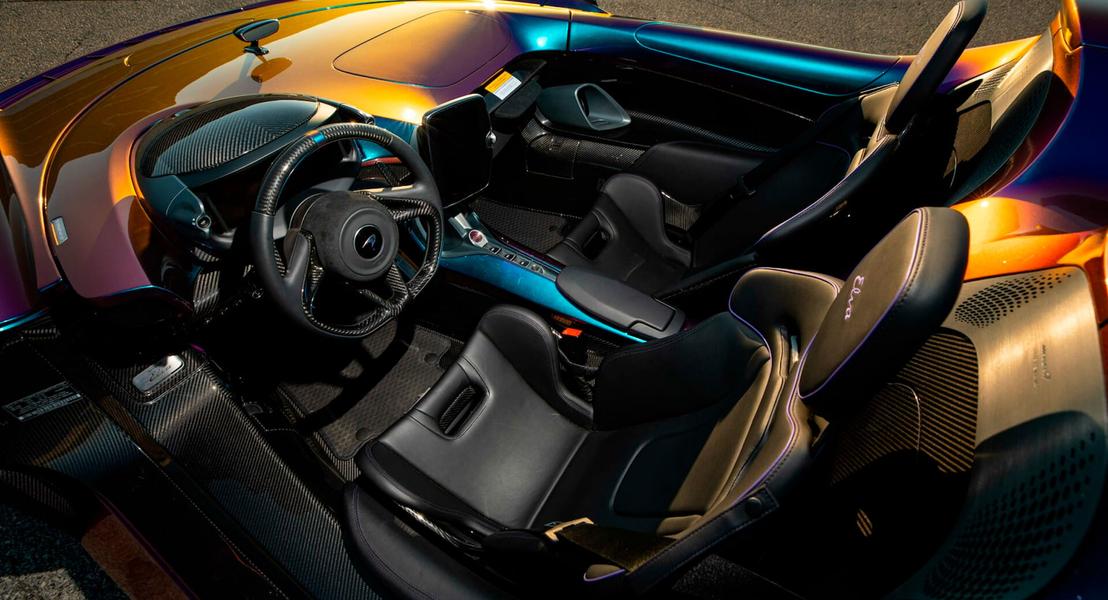 Что касается отделки салона, то он выполнен из неокрашенного углепластика и фирменного черного текстиля Ultrafabric. При массе 1198 килограммов Elva — это самый лёгкий серийный автомобиль McLaren, весящий даже меньше, чем гиперкар McLaren Senna.