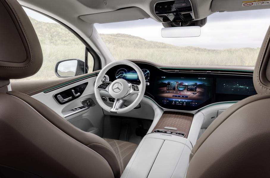 Салон EQE SUV может быть только пятиместным, и это ключевое отличие от трёхрядного EQS SUV. Для передних седоков новые электромобили Mercedes-Benz практически одинаковы: богатым комплектациям положен информационно-развлекательный комплекс MBUX Hyperscreen с 56-дюймовым экраном, есть голосовой помощник и встроенная навигация.
