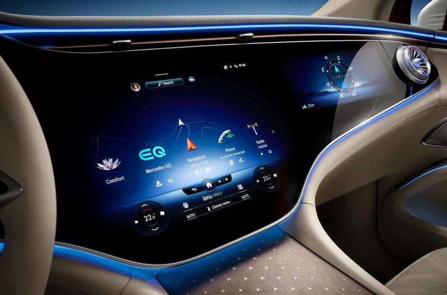 Одна из наиболее выделяющихся деталей в салоне — медиакомплекс MBUX Hyperscreen с цифровой панелью общей диагональю 56 дюймов, хотя самым простым версиям положен вариант без пассажирского дисплея и с раздельными экранами приборов и мультимедийной системой. Зато уже в базовой комплектации электрорегулировки есть не только у передних кресел, но и у сидений второго ряда.