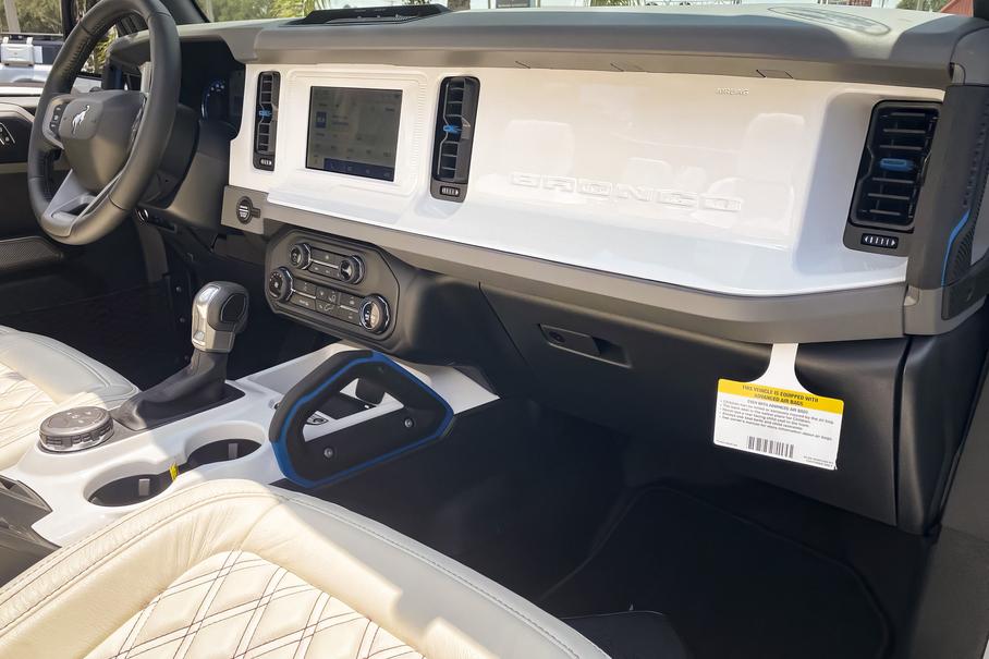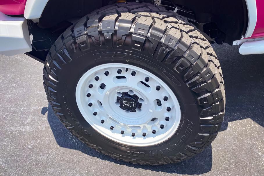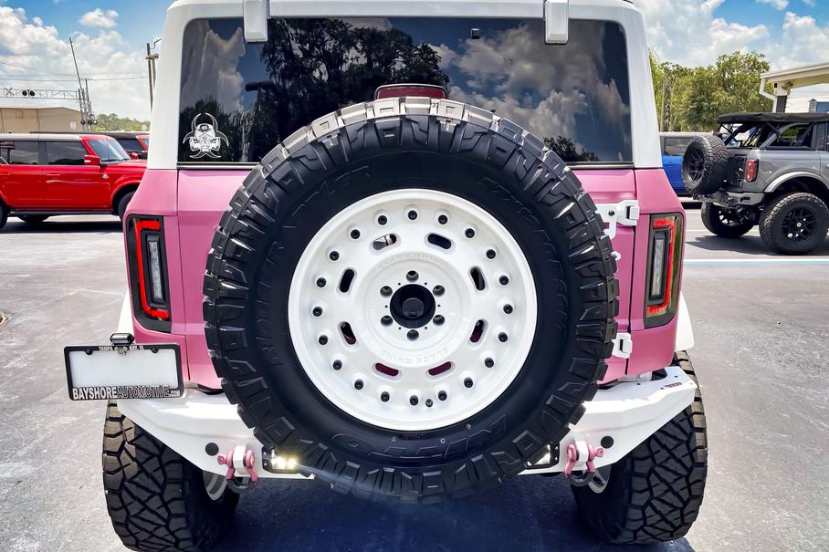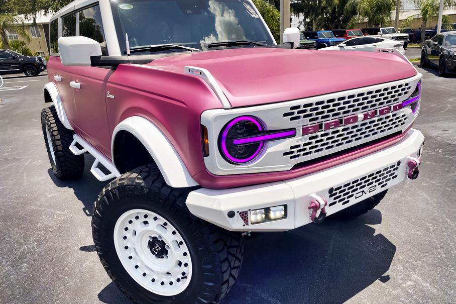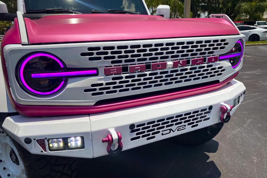 При этом модель сохранила свои внедорожные характеристикиПомимо розовой отделки кузова и белого кожаного салона, Bronco оборудовали силовыми бамперами, накладками на порогах, а также 20-дюймовыми колесными дисками с грязевыми покрышками и расширителями арок. Кроме того, внедорожник получил дополнительные световые приборы в переднем бампере и головную оптику, меняющую цвет.