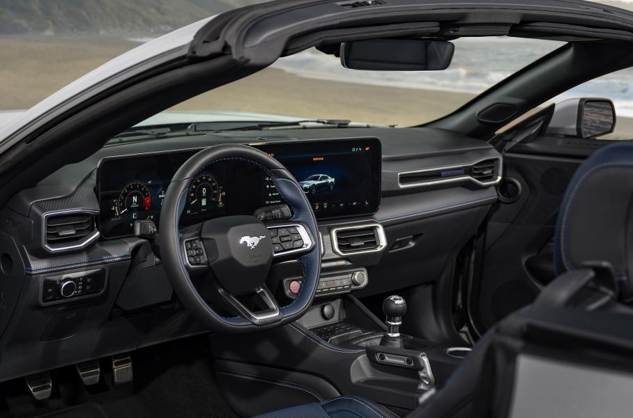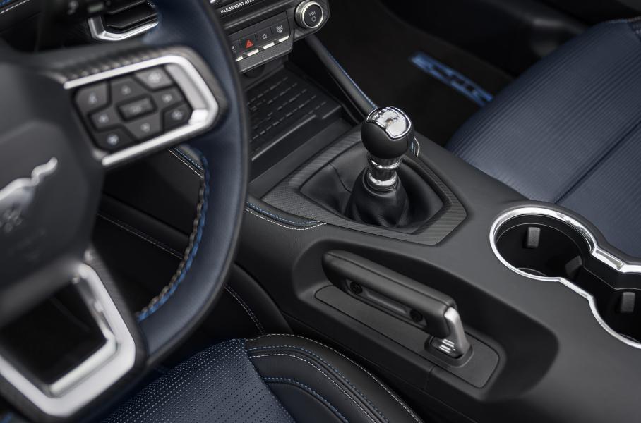 Фирменный оттенок California Special называется Rave Blue. В него выкрашены рамки воздухозаборников на решетке радиатора, колеса и логотипы. Сиденья в GT/CS обиты перфорированной кожей Navy Pier и обычной Ebony Black с прострочкой Raptor Blue и Metal Gray. Спецверсию можно заказать в кузове фастбек либо кабриолет, с шестиступенчатой «механикой» или же с опциональным десятидиапазнным автоматом. Двигатель один — «атмосферник» V8 5.0 семейства Coyote мощностью 493 силы и 567 Нм.