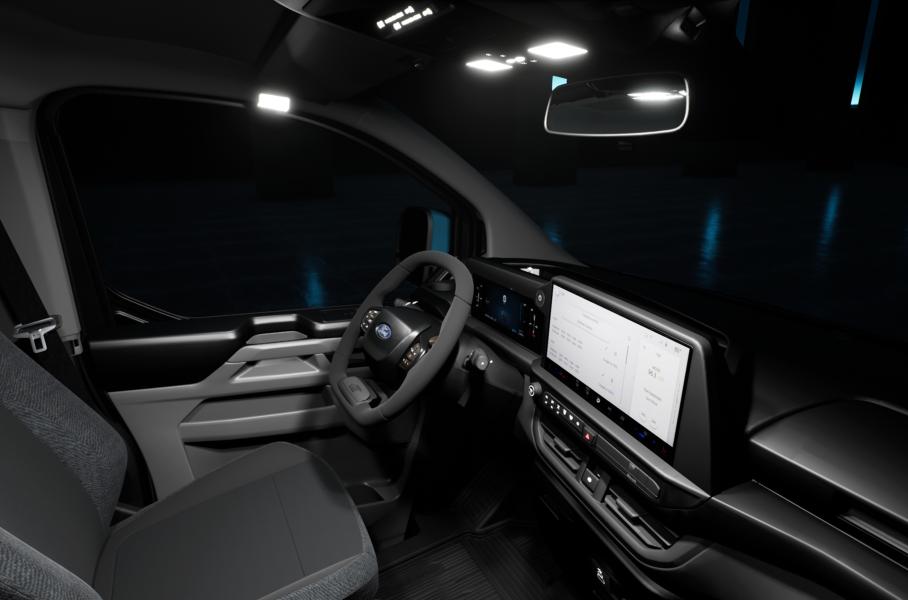 В оснащение E-Transit Custom входят медиасистема SYNC 4 с 13-дюймовым центральным дисплеем и поддержкой связи 5G. Также заявлены широкий перечень электронных ассистентов и комплекс телематики Ford Pro E‑Telematics с бесплатной годовой подпиской. Среди новшеств — первая в сегменте потолочная подушка безопасности (заменяет эйрбеги водителя и пассажиров), тепловой насос с промежуточным впрыском пара и наклонный руль (часть пакета Mobile Office, «мобильный офис»), который служит подставкой для планшетов и ноутбуков.
