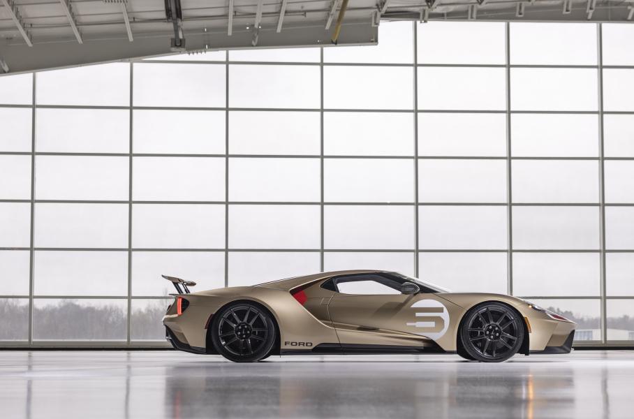 Специальная версия нынешнего Ford GT оформлена в стиле того самого автомобиля. Суперкар украшен золотисто-красной ливреей и элементами из углепластика с видимым плетением нитей. Цифры «5» в кружках