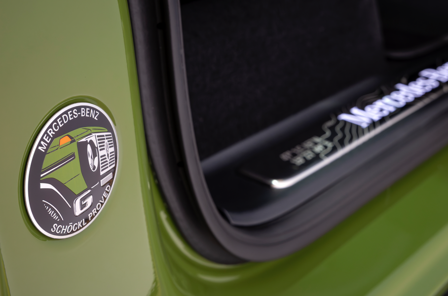 При открытии двери владельца встретит световая проекция с надписью G — Stronger Than Time. В салоне установлены сиденья, обитые клетчатой тканью (еще одна отсылка к прошлому) с элементами из натуральной кожи. Однако в остальном интерьер современный — с цифровой «приборкой», мультирулем и аудиосистемой Burmester. Центральная консоль помечена порядковым номером экземпляра.