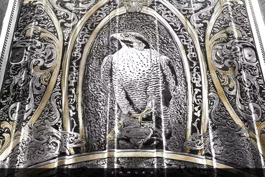 Рисунок выполнен полностью вручнуюГлавная особенность внедорожника — крыша, на которой вручную выгравировано изображение сокола в лесу. Ещё больше гравировки можно увидеть на боковых молдингах и колёсных арках, где используются декоративные узоры, а также контраст полированного металла с вкраплениями золота, которые подчеркивают — тоже эксклюзивный! — янтарный цвет кузова.
