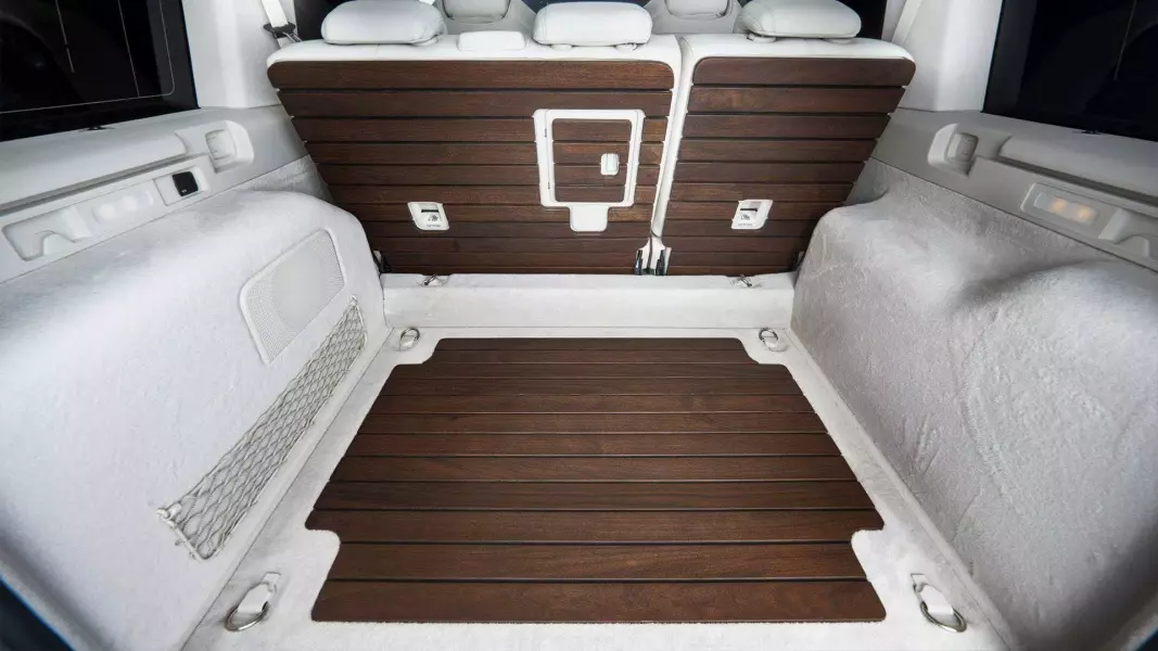 Необычные деревянные панели можно найти вместо штатных ковриков, на руле, поручне передней панели со стороны пассажира, на тыльной стороне сидений второго ряда и на полу багажника. Превращение внедорожника в сухопутную яхту обойдётся минимум в 329 тысяч евро.