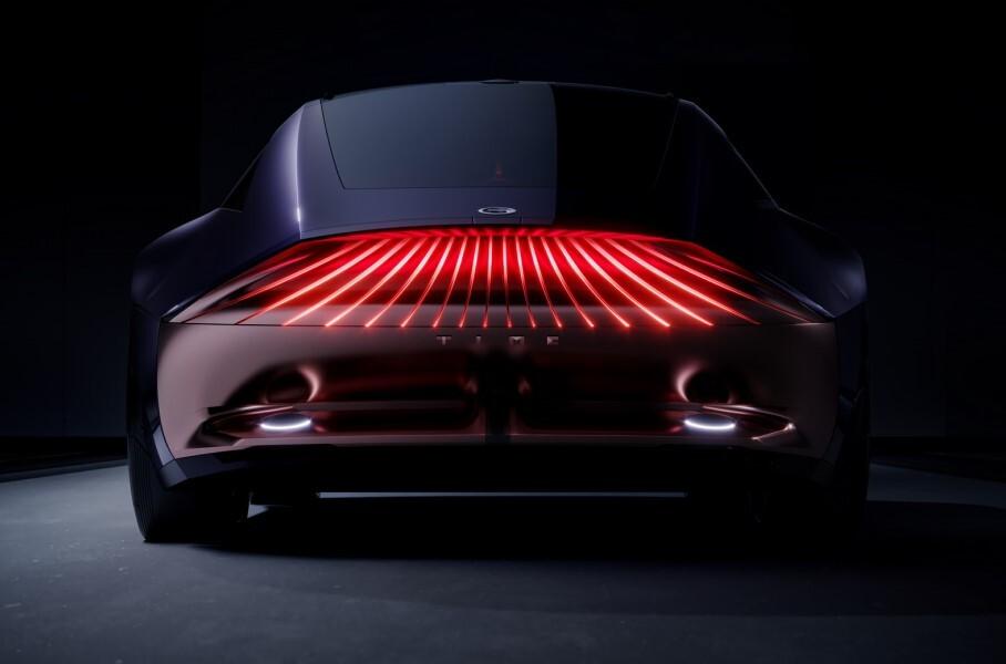 Водительское кресло в салоне окружено длинной изогнутой скамьейTime досталась покатая крыша, растянутая до конца кормы и заканчивающаяся наклоненным обрезом, а также сильно заваленное лобовое стекло. Коэффициент аэродинамического сопротивления шоу-кара — 0,191 Cd, и в этом Time уступает как Mercedes-Benz Vision EQXX с 0,17 Cd, так и собственному концепту GAC ENO.146 2019 года с показателем 0,146 Cd. Ступицы колес имеют трехмерный рисунок, создаваемый с помощью голографической проекции, а в переднюю оптику встроены вращающиеся светодиодные блоки. Тонкие полосы фонарей вторят декору в интерьере.