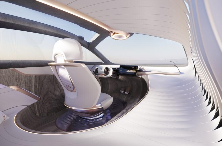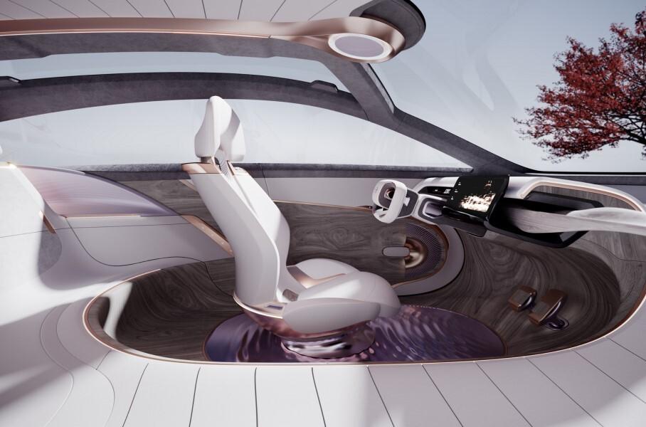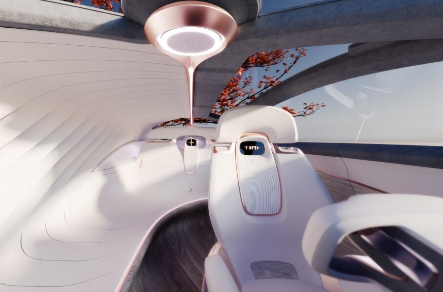 При создании салона, отделанного деревом, Time дизайнеры вдохновлялись неориентируемыми поверхностями — лентой Мёбиуса и бутылкой Клейна. Традиционное сиденье здесь только одно — это водительское кресло, пол под которым имитирует «чистую рябь» на воде. Лаконичный кокпит включает в себя цифровую «приборку», небольшой сенсорный экран и руль-штурвал. Передняя панель перетекает в длинный диван с растянутой до потолка спинкой, перекрывающей обзор справа.