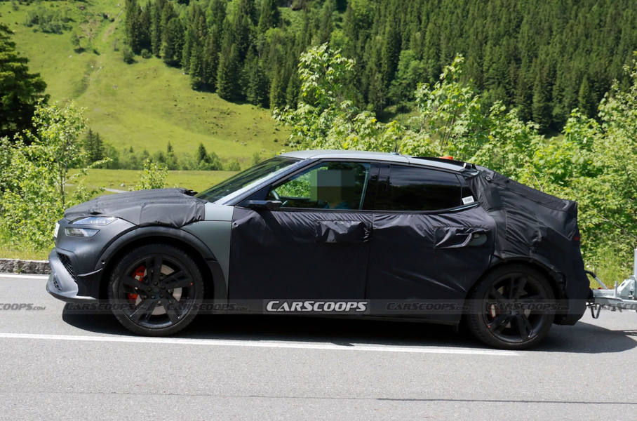 Электрокар может дебютировать в июле нынешнего годаКузов тестового прототипа обмотан черным полотном, но передок почти полностью открыт. На нем видны фирменные полоски оптики, «двухэтажная» решетка с сетчатым рисунком и воздухозаборники по бокам. Серийному GV60 Magma обещан ярко-оранжевый цвет кузова, но пока Genesis решил не привлекать лишнего внимания и собрал прототип из панелей серых оттенков.