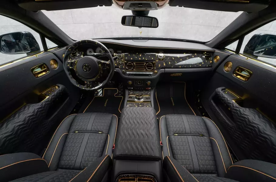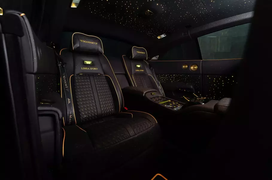 Купе в черно-золотом стиле выпущено в рамках эксклюзивной линейки Linea d’OroВ рамках своей премиальной программы Linea d’Oro тюнинг-ателье Mansory представило роскошный вариант Rolls-Royce Wraith. Основной акцент сделан на отделке 24-каратным золотом, которое использовано как в экстерьере, так и в интерьере — от панелей кузова до кованых колес. Новый аэродинамический обвес выполнен из углепластика и придает купе более агрессивный вид.