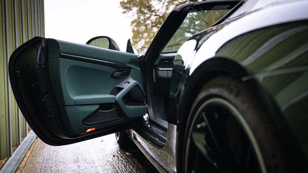В итоге получился открытый спорткар, окрашенный в фирменный тёмно-зелёный цвет Porsche, колёса которого выполнены в тон кузову с контрастной серебристой полосой, а салон целиком — от сидений, вентиляционных решёток, рулевого колеса, дверных карт, солнцезащитных козырьков, краёв напольных ковриков, крышки блока предохранителей, спрятанной в пространстве для ног — отделан тёмно-зелёной кожей.