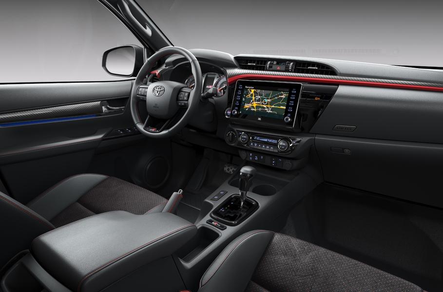Он отличается перенастроенной подвеской и декоромВизуально Hilux GR Sport можно отличить по полностью чёрной решётке радиатора с рисунком в виде пчелиных сот и массивной перемычке с надписью Toyota в стиле «Хайлаксов» четвёртого поколения. Другие обязательные атрибуты версии — чёрные корпуса зеркал, подножки, расширители колёсных арок и двухцветные 17-дюймовые колёса, на контрасте с которым играют выкрашенные в красный цвет элементы подвески. Салон Hilux выделяется комбинированной обивкой сидений из кожи и искусственной замши, эмблемами GR Sport, алюминиевыми педалями и накладками «под карбон».