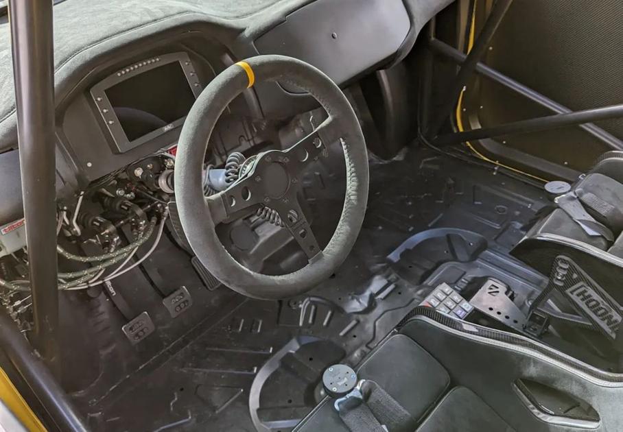 Уникальный пикап, лишенный части кузова, дополнительно усилен каркасом безопасности, а штатные панели заменены обвесом из углепластика и фибергласса от Advanced Fiberglass Concepts. В салоне появились карбоновые кресла Recaro Podium с шеститочечными ремнями безопасности Willans, многофункциональная панель приборов MoTeC, руль Momo Protopito и педальный узел Tilton.