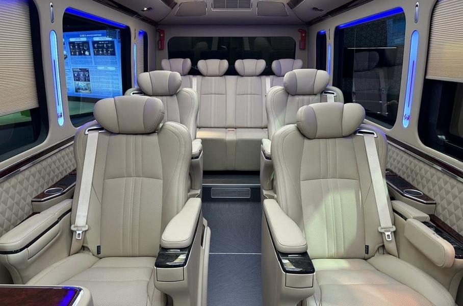 Есть стационарные столики для работы и трапезы, встроенный холодильник, бар, шторки на окнах, ниша для зонтиков, контурная подсветка, отдельный кондиционер, динамики в духе кинотеатра и многое другое. Отделочные материалы богатые: есть деревянные вставки, пол мягкий, все сиденья и даже столики обшиты светлой кожей. Доступно две силовых установки: чисто бензиновая с V6 и последовательный гибрид с «турбочетвёркой».