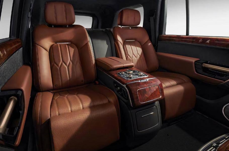 Дизайн выполнен в типичном для Hongqi стиле и напоминает об электрическом E-HS9. Сохранены и неизменные атрибуты марки в виде продольного «гребешка» на носу и «развевающихся флагов» на боковинах. Салон строго четырехместный, он щедро отделан кожей, шпоном красного дерева и золотистым декором. Индивидуальные кресла второго ряда разделены широкой консолью, оснащены оттоманками, подогревом и вентиляцией. Руль — как у старых Hongqi, а на передней панели есть даже кварцевые часы.