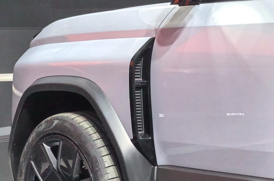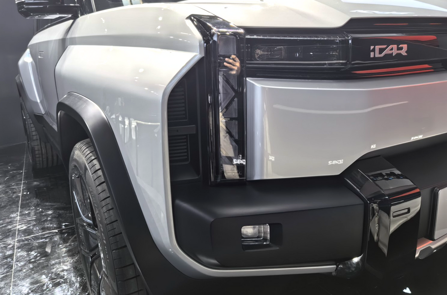 Электрокросс с «квадратным» дизайном стал еще брутальнееChery iCar 03T достались массивные бамперы и новые колесные арки, скрывающие более крупные черные колесные диски во внедорожных шинах. Капот стал более рельефным, а на крыше виден экспедиционный багажник с тонкой светодиодной «люстрой».