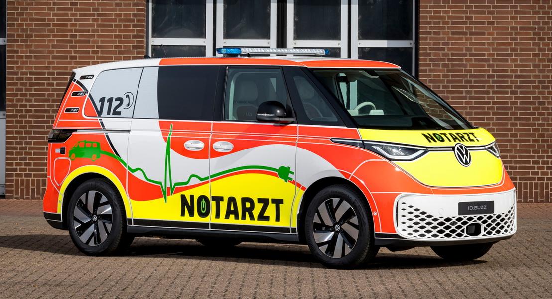 И в ещё несколько специальных вариантовСилами ателье Bosenberg был подготовлен медицинский вариант фургона ID. Buzz Cargo, который визуально выделяется яркой жёлто-оранжево-белой окраской и наличием спецсигналов. Салон позволяет разместить трёх человек или трансформироваться в рабочее место для врача и одного пациента, для оказания помощи которому есть необходимое оборудование.