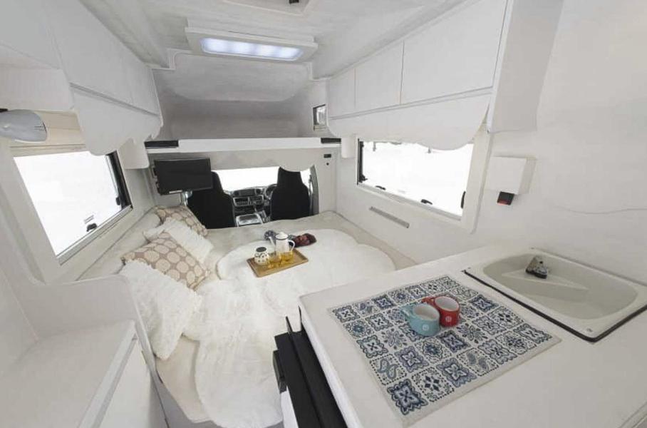 В белом цвете также выполнены полки для хранения вещей, спальные места для четверых, кухонная зона и оконные шторки, а разбавляют монохромную гамму аксессуары, а также черно-серая водительская кабина и телевизор. В автодоме нем нет ни туалета, ни душа, а кухня оснащена только раковиной. Впрочем, это – лишь концепт, построенный в рекламных целях для горнолыжного курорта Hoshino Resort Alz Bandai.