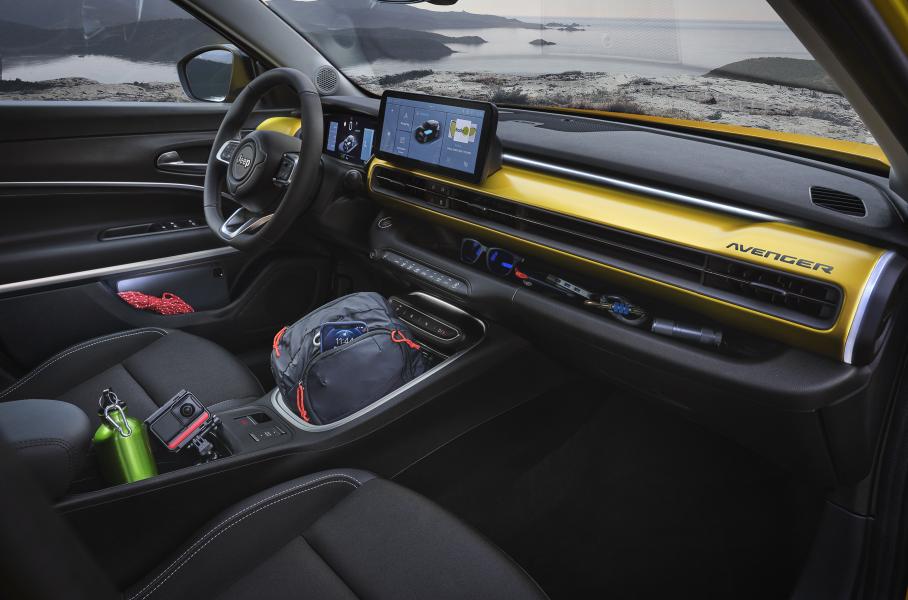 Дизайн интерьера вдохновлен минималистичным оформлением салона Jeep Wrangler. Вдоль всей передней панели расположена контрастная деталь, которую в компании называют «лучом». На ней находятся воздуховоды и некоторые кнопки управления. Чуть ниже — довольно объемный отсек для хранения мелких вещей. На центральном тоннеле разместилась модульная система хранения, которую можно настраивать персонально под себя. В пространстве рядом с селектором трансмиссии есть дополнительный отсек, где можно одновременно заряжать смартфон и разместить бутылку воды объемом 1,5 литра.