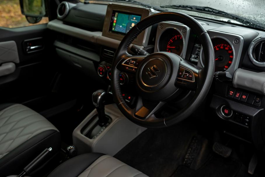 Для превращения базового трехдверного Jimny в шестиколесный внедорожник использовались оригинальные детали, включая штатный мост. Привод передается только на переднюю и среднюю оси, коробка передач автоматическая. В отделке салона применена кожа в оттенках черного и светло-серого, а из оснащения заявлена мультимедийная система с Apple CarPlay и сразу два запасных колеса. Обут этот Jimny в новый комплект грязевых шин.