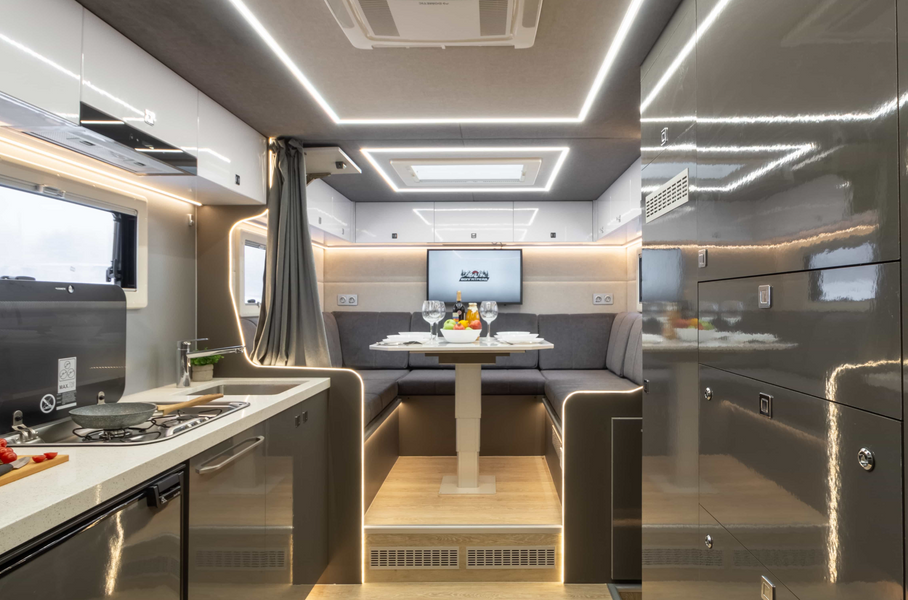 Кроме того, кемпер оснащен тропическим душем Grohe, яхтным мацераторным туалетом с гигиеническим душем. Также предусмотрено несколько розеток и USB-входов. Телевизоров два, а за звук отвечает саундбар с сабвуфером.