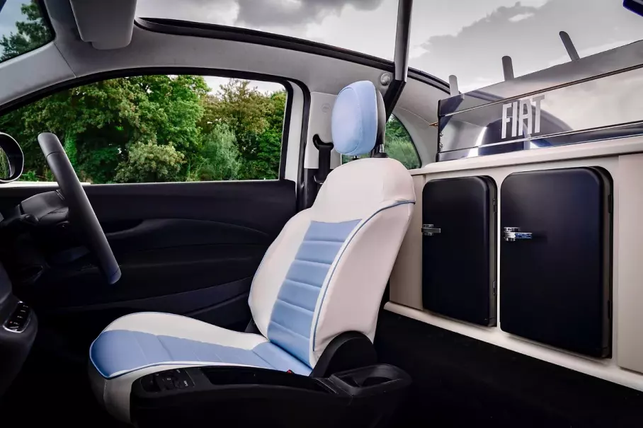 Новинку создало подразделение Fiat в ВеликобританииGelateria Edition имеет уникальную двухцветную цветовую отделку, напоминающую дух классического итальянского мороженого 1950-х годов — интерьер и экстерьер выполнены в насыщенных голубых и кремовых тонах. Задние сиденья демонтированы — на их месте расположен шкаф, в котором установлены двойные морозильные камеры с питанием от аккумулятора, вмещающие до 30 литров мороженого.