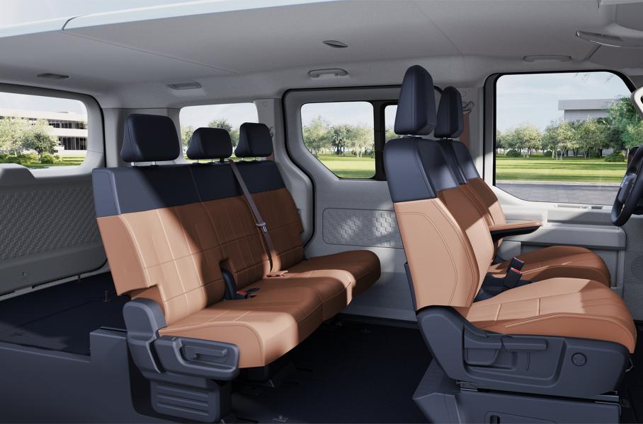 В стандартной комплектации Kia PV5 положена виртуальная панель приборов, медиасистема с 12,9-дюймовым тачскрином и мультируль. Заявлена целая гамма износостойких отделочных материалов в том числе из вторсырья. Салон может быть чёрным, серым, синим или коричневым, причём на снимках изображены комбинированные варианты. Полезный объём самого большого фургона — более пяти кубометров!