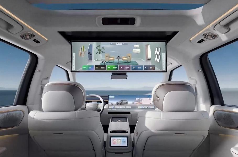В салоне влияние Ли Сяна заметно: такой же миниатюрный экран панели приборов, такой же составной тачскрин, смещенный вправо. Диагональ мониторов — 30 дюймов, разрешение — 6К. Аналогичный дисплей доступен для задних пассажиров: он откидывается с потолка. Есть встроенный холодильник, аудиосистема Harman/Kardon с динамиками в подголовниках, у всех трех рядов электрорегулировки, второй ряд можно сдвигать в диапазоне 550 мм, третий — на 125 мм.