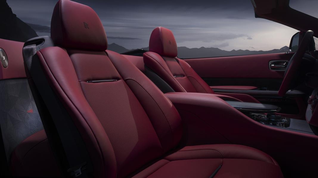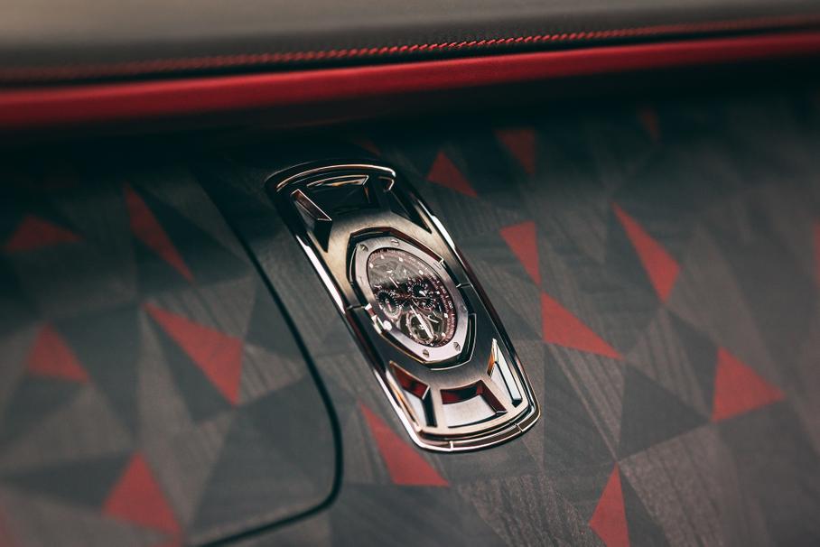 Каждый треугольник вырезан из древесины чёрного платана, отшлифован и установлен вручную. Для обивки сидений использована тёмно-красная кожа Mystery по краям и светло-красная кожа True Love, каждая из которых дополнена тонкими медными элементами, напоминающим перламутровую текстуру лепестков роз Black Baccara. Передняя панель украшена эксклюзивными часами Audemars Piguet Royal Oak Concept Split-Seconds Chronograph GMT Large Date. Церемонию получения автомобиля клиенты решили отметить эксклюзивным шампанским от Champagne de Lossy, для которого в Rolls-Royce сделали особый ящик.
