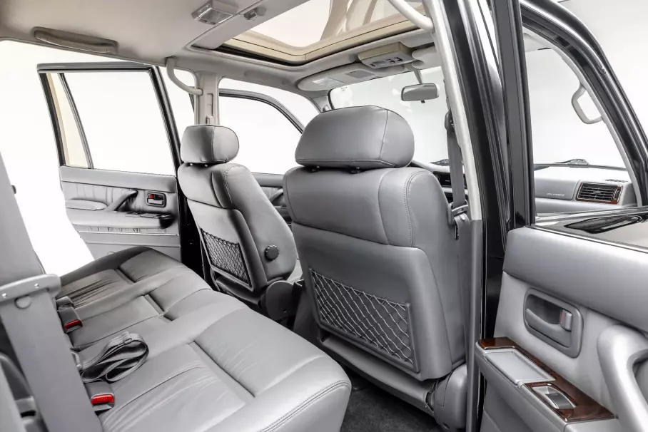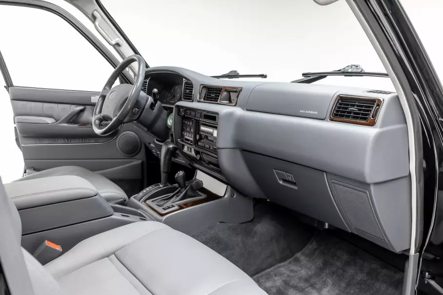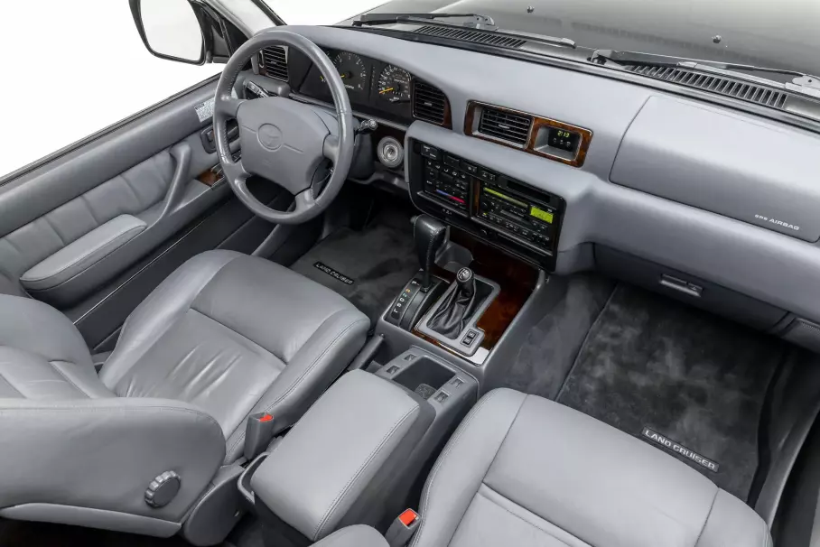 Чёрный «Крузак» оснащён рядным 6-цилиндровым 4,5-литровым бензиновым мотором 1FZ-FE, 4-ступенчатым автоматом, двухдиапазонной раздаточной коробкой и блокировками трёх дифференциалов. Салон отделан серой кожей и декоративными панелями под дерево, сохранилась и заводская магнитола с кассетным проигрывателем и CD-плеером.