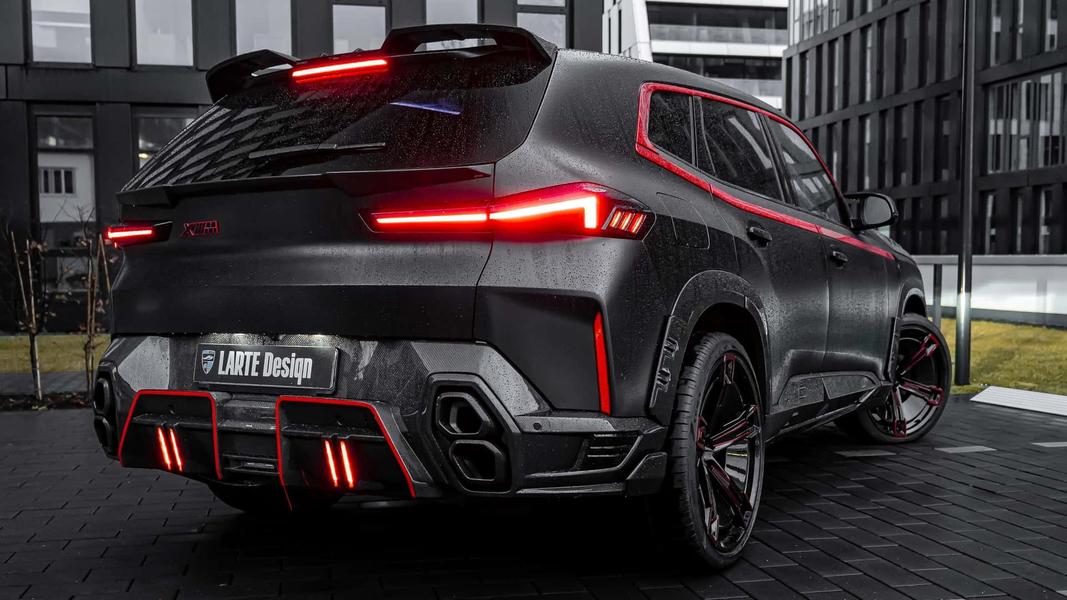 Кроссовер также получил 23-дюймовые кованые диски с красной окантовкой и аэродинамическими обтекателями. Каждая деталь обвеса изготавливается вручную на собственном производстве полного цикла Larte Design. Клиенты ателье могут выбрать цвет деталей обвеса. Их можно окрасить в один из фирменных оттенков баварской марки — Black Carbon Metallic, Individual Urban Green Metallic и Skyscraper Grey Metallic, либо сделать глянцево-чёрными.