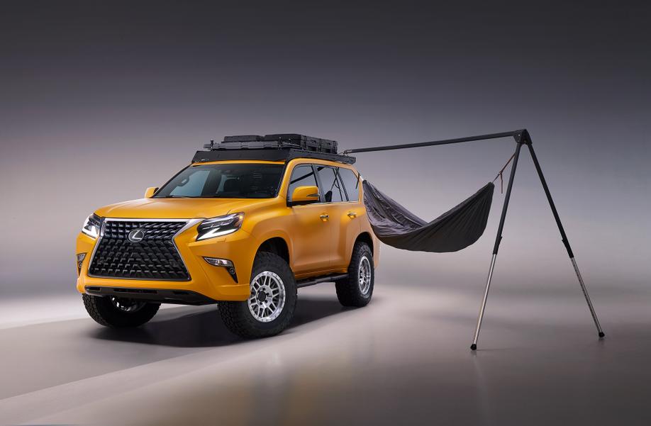 Lexus GX представлен сразу в двух версиях. GX 460 Premium AAP предыдущего поколения выделяется матово-жёлтой окраской кузова Matte Yellow Saffron, серебристыми 18-дюймовыми колёсами с 34-дюймовыми шинами Toyo Open Country A/T. Днище автомобиля защищено пластинами от CBI Offroad. На крыше установлен багажник Prinsu, на котором закреплёны стойка для крепления гамака Kammok Outpost Overland и сам двухместный гамак Kammok Roo Double . В багажнике расположен 63-литровый багажник ARB с морозильной камерой, защитой Goose Gear и панелью Prinsu для размещения аксессуаров на боковом окне.
