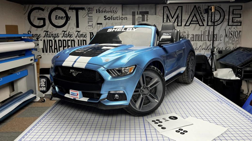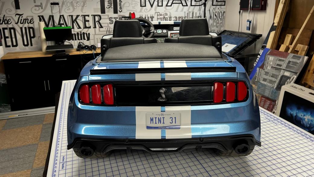 Но для создания большего сходства с реальной машиной миниатюрную модель подвергли тюнингу. Детский электромобиль получил диски, похожие на колёса Mustang Shelby GT500, фирменные наклейки на кузов и эмблемы с гадюкой, а также наклейку с названием Shelby на ветровом стекле спорткара для маленького поклонника марки.