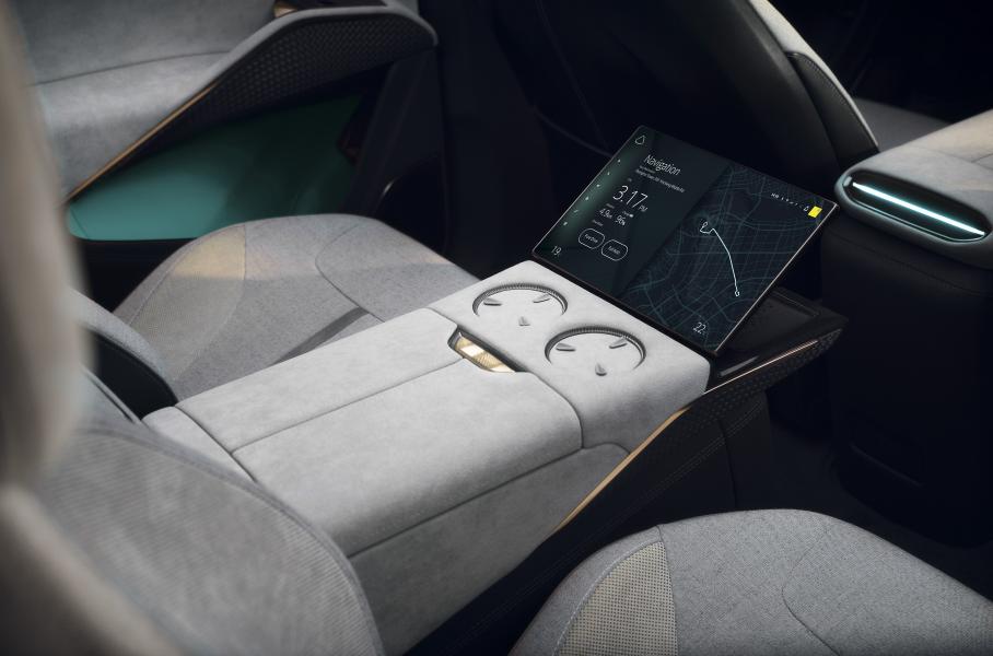 В салоне применены прочный синтетический текстиль и легкие смеси шерсти, которые весят в два раза меньше, чем натуральная кожа. На передней панели разместили крошечную приборную панель высотой всего три сантиметра, на которой по умолчанию отображается только самая нужная информация. Такая же панель есть со стороны пассажира, а между ними – складной 15,1-дюймовый экран «мультимедийки», обеспечивающий доступ к 95 процентам функций за три прикосновения. Когда в нем нет необходимости, он автоматически складывается.