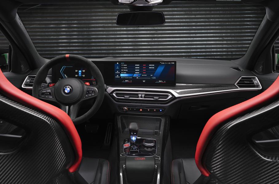 Внешне M3 CS отличился бескаркасной решеткой радиатора с красным контуром и значком с названием модели, а также желтыми фарами BMW Laserlight. В салоне — штатный для M3 изогнутый экран системы iDrive 8, объединяющий 14,9-дюймовый дисплей мультимедийной системы и 12,3-дюймовую «приборку».