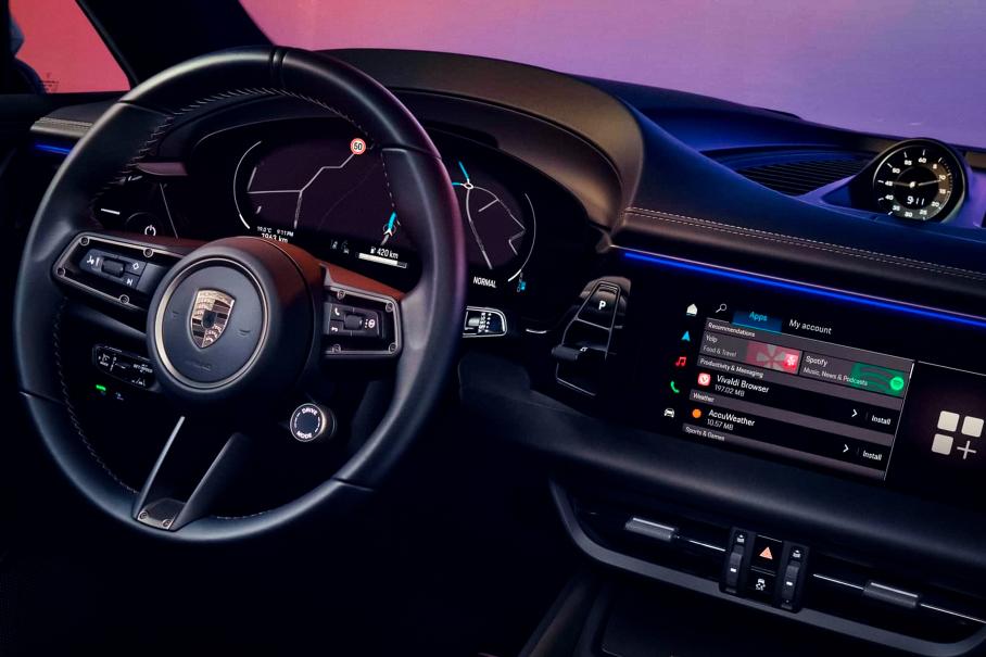 Вопреки общей тенденции Porsche не отказалась от физических кнопок и переключателей, их в салоне Macan немало. На центральной консоли можно увидеть комбинированный блок управления температурой, подогревом и вентиляцией кресел. Главная же фишка электрического Macan — проекция с дополненной реальностью, которая выводит подсказки для водителя на лобовое стекло. На официальных фотографиях показали стрелки навигации и графику системы контроля полосы.