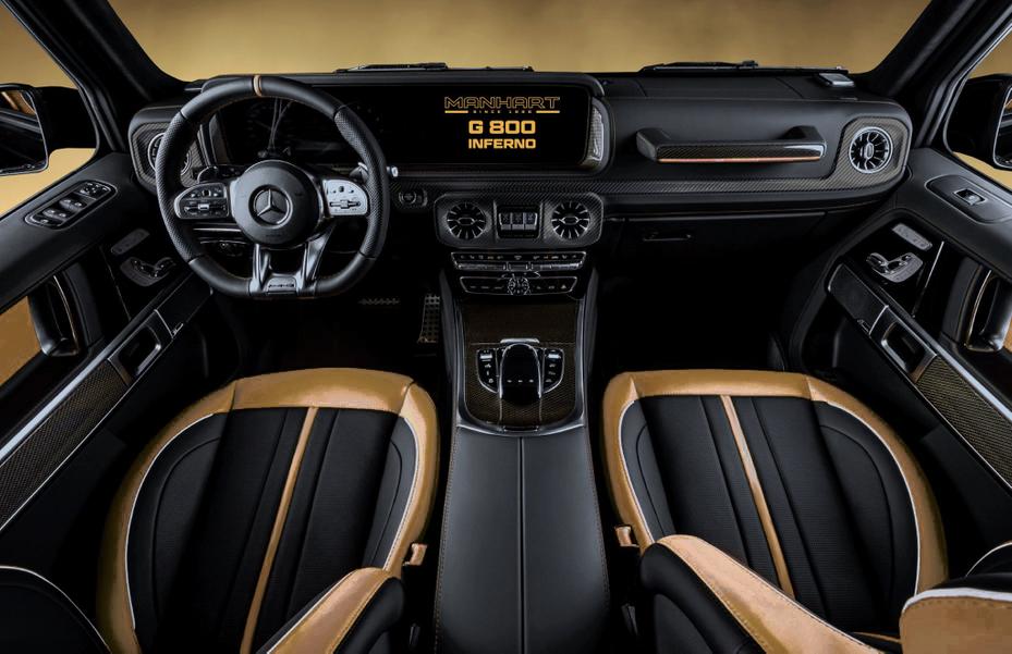 Собственно, мощность и дала название проекту — G 800 Inferno. Внедорожник получил углепластиковый аэродинамический обвес от ателье TopCar Design, который дополнен фирменными колёсами Manhart Forged Line (в сочетании пружинами H&R) золотого цвета.