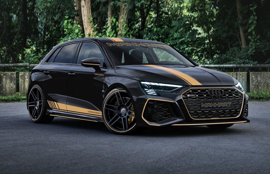 Готовых автомобилей Manhart RS3 500 пока нет, но на компьютерных рендерах можно оценить масштаб доработки экстерьера — в тюнинг-ателье подготовили новые бампера и накладки на колёсные арки, а также традиционный для компании набор золотистых наклеек для кузова. Предусмотрены и новые 20-дюймовые колёса Concave One.