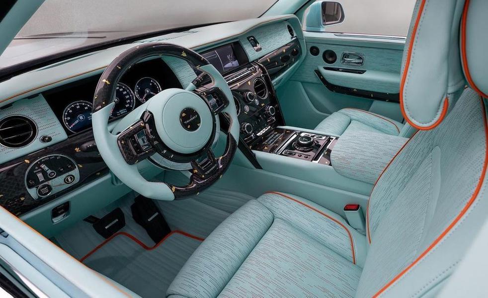 В тон экстерьеру переоформлен и салон, в котором доминирует бирюзовая кожа, дополненная оранжевыми акцентами. Чёрные декоративные элементы также инкрустированы драгоценным металлом, в роли которого — сусальное золото.