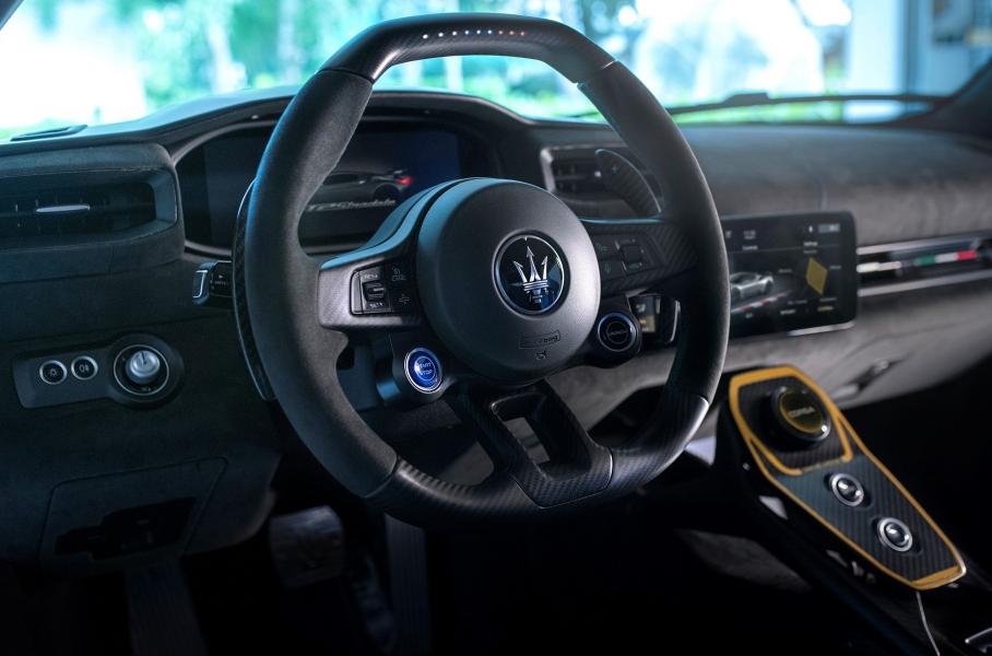 Двигатель V6 Nettuno обрел новую выпускную систему и перенастроенные турбокомпрессоры, но на отдаче это сказалось мало: мощность выросла до 640 лошадиных сил (+10 сил), а крутящий момент снизился до 720 Нм (-10 Нм). Разгонная динамика улучшилась (время разгона 0-100 сократилось до 2,8 секунды), а максимальная скорость уменьшена на символический 1 км/ч (до 324 км/ч). Салон не стал спартанским: осталась аудиосистема с 12 динамиками и тачскрином, беспроводная зарядка для гаджетов и отделка алькантарой.