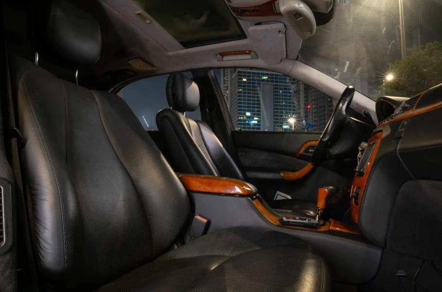Внешне и по салону такой AMG мало чем выделяется, разве что дорестайлинговый седан из Аффальтербаха сам по себе вызывает удивление. Комплектация богатая, но сборка типичная: серебристый кузов, составные пятиспицевые диски, чёрный салон с лакированными деревянными вставками. В списке опций активная подвеска, вентилируемые кресла с памятью и столики для задних пассажиров.