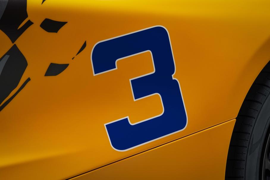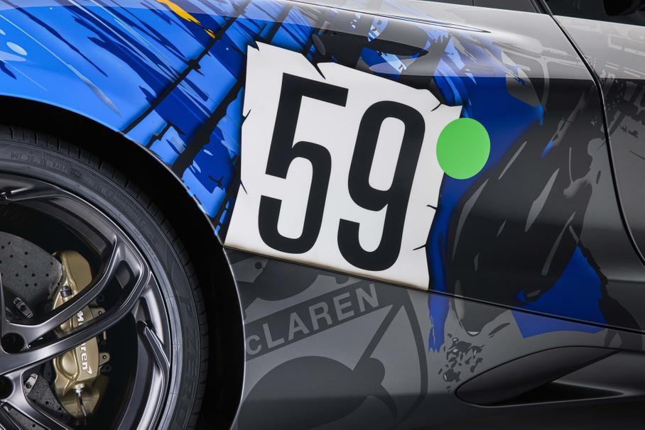 На другой стороне использован яркий синий «всплеск», вдохновлённый цветом гоночного номера и созданный с помощью векторной обработки. Использование четырёх оттенков синего цвета придаёт ему трёхмерный эффект. Под определенным углом на кронштейне ходовых огней внутри крепления фары видна надпись «3-7-59». На дверях нанесены серебряные логотипы Triple Crown с патиной и позолотой. Логотипы Triple Crown вышиты в фирменном оранжевом цвете McLaren Orange.