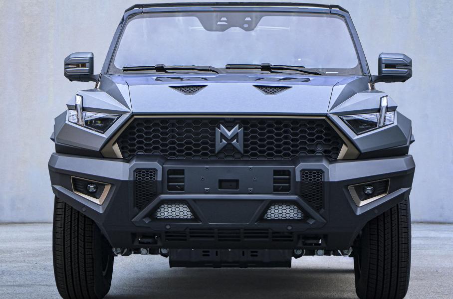 Цена вездехода немаленькая — почти 16 миллионов рублейСерийный Mengshi M-Hero 917 на 80 процентов повторяет дизайн концепта M-Terrain: у него те же ломаные грани кузова, вынесенные наружу дверные петли и восьмиугольный бокс на пятой двери. Длина кузова вездехода — почти пять метров, что делает его чуть крупнее восьмиместного Hyundai Palisade. Впечатляет и снаряженная масса, составляющая 3293 килограмма.