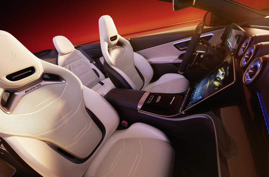 В салоне купе — сиденья с обивкой из черной кожи AMG Nappa и желтой контрастной строчкой, а для кабриолета выбрали белую кожу с черными акцентами. По умолчанию интерьеры украшены декором из углеродного волокна, подсвечивающимися буквами AMG на порогах, особыми ковриками и значками.